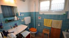 ein Lavabo mit Spiegelschrank, eine Toilette sowie ein weiteres Fenster.